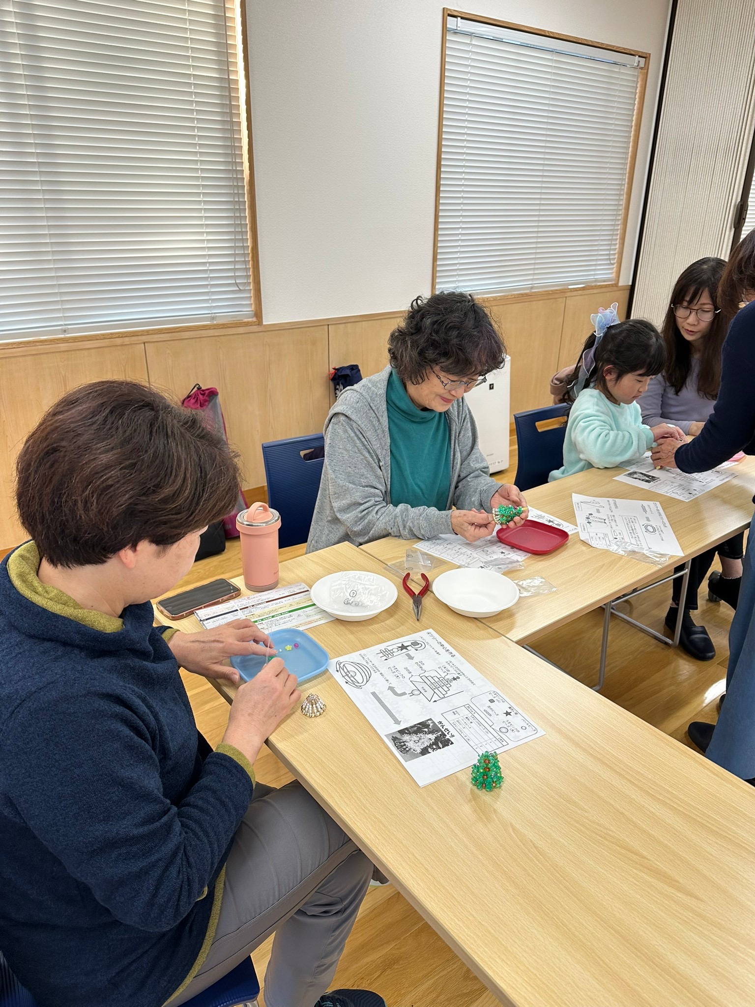 きれいなアクリルビーズ、フラワービーズ、安全ピンを、針金に通して、ツリーの形にしていきます