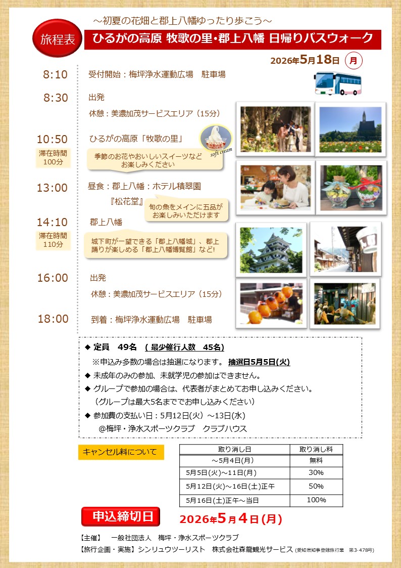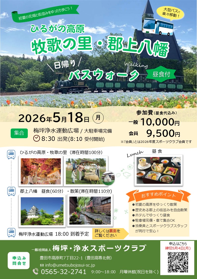 初夏の日帰りバスウォーク🚌!!! 5月18日(月)「牧歌の里」・「郡上八幡」